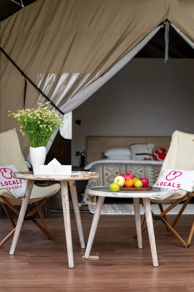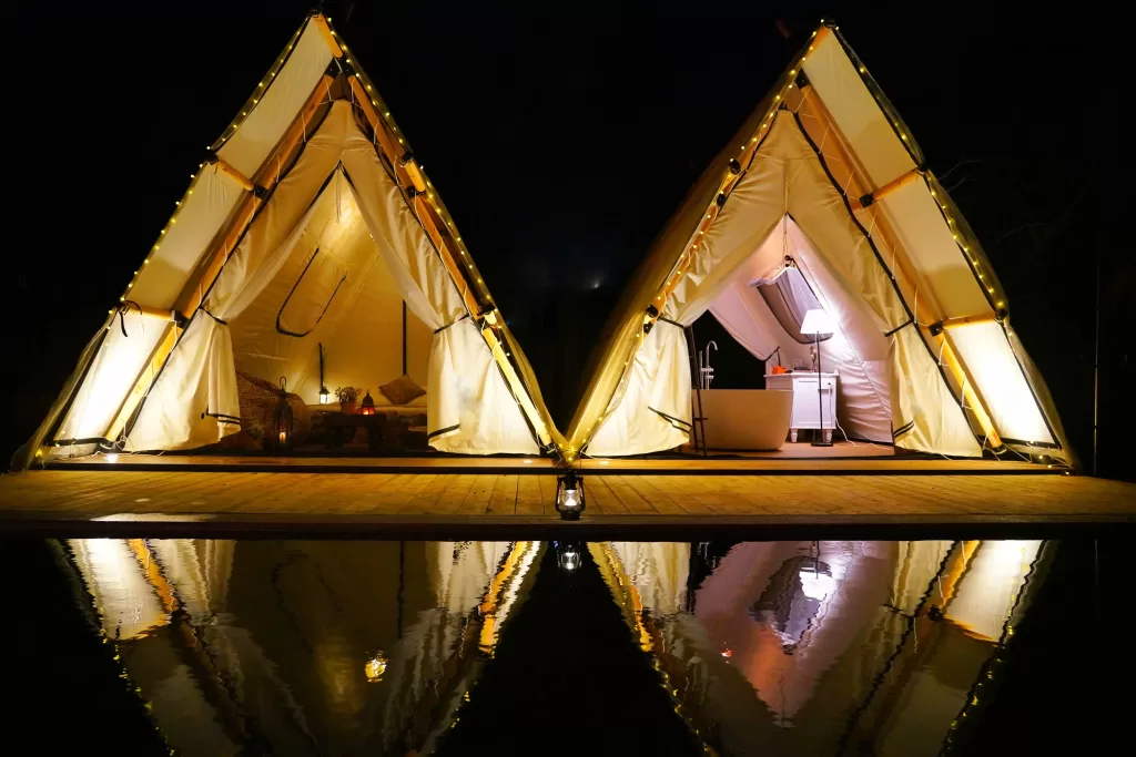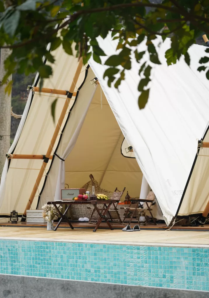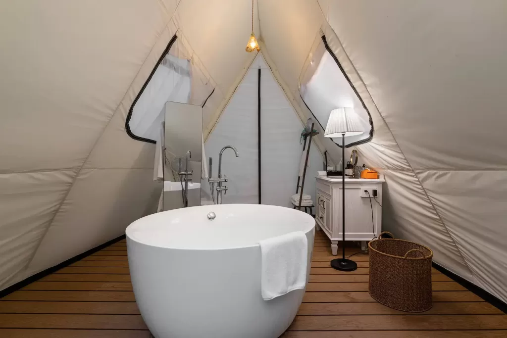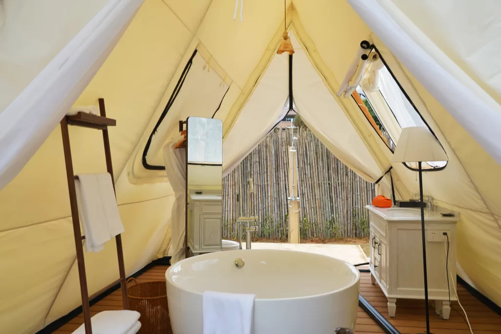 共有三顶野奢轻骑帐篷,每顶35平方英尺,采用PVC篷布和防水牛津布,打造非洲部落风格的露营小屋帐篷。我们的理念是在不牺牲乡村自然环境的前提下,让您住在野外帐篷里更贴近自然。豪华轻骑帐篷有水、电和宽敞的双人床。必要时,室内还可以提供榻榻米或木地板作为床垫,满足顾客休息的需求。每个豪华帐篷露营地都提供3x5m的阳台区域,让客人有放松的空间。野营帐篷配有天然环保的燃木浴缸。在星空下喝着您最喜欢的酒,度过一段特别的时光,享受极致的放松。