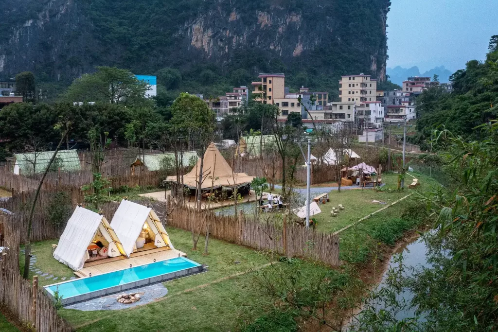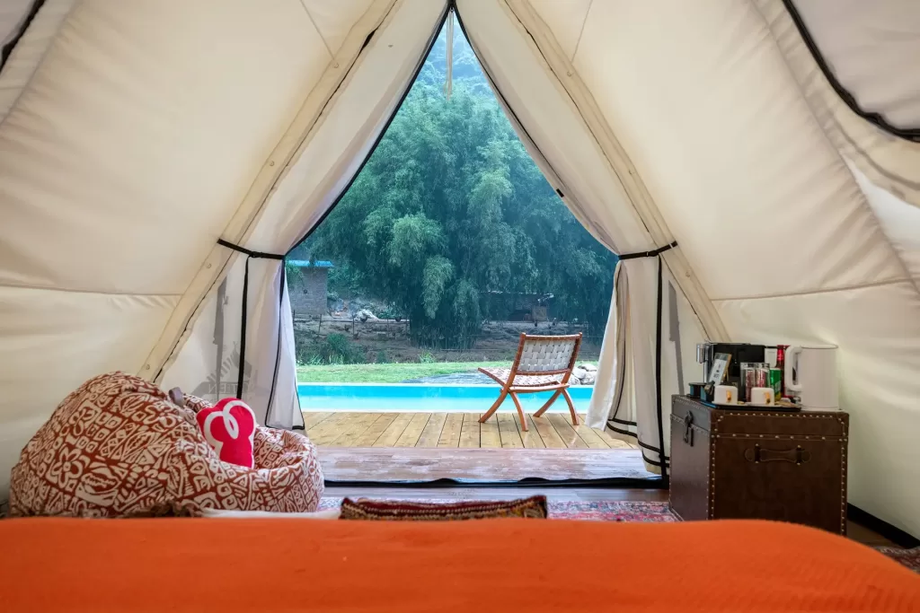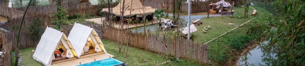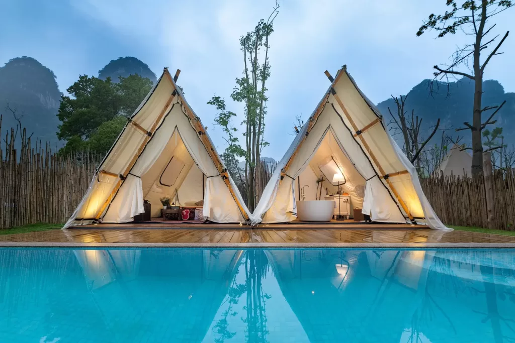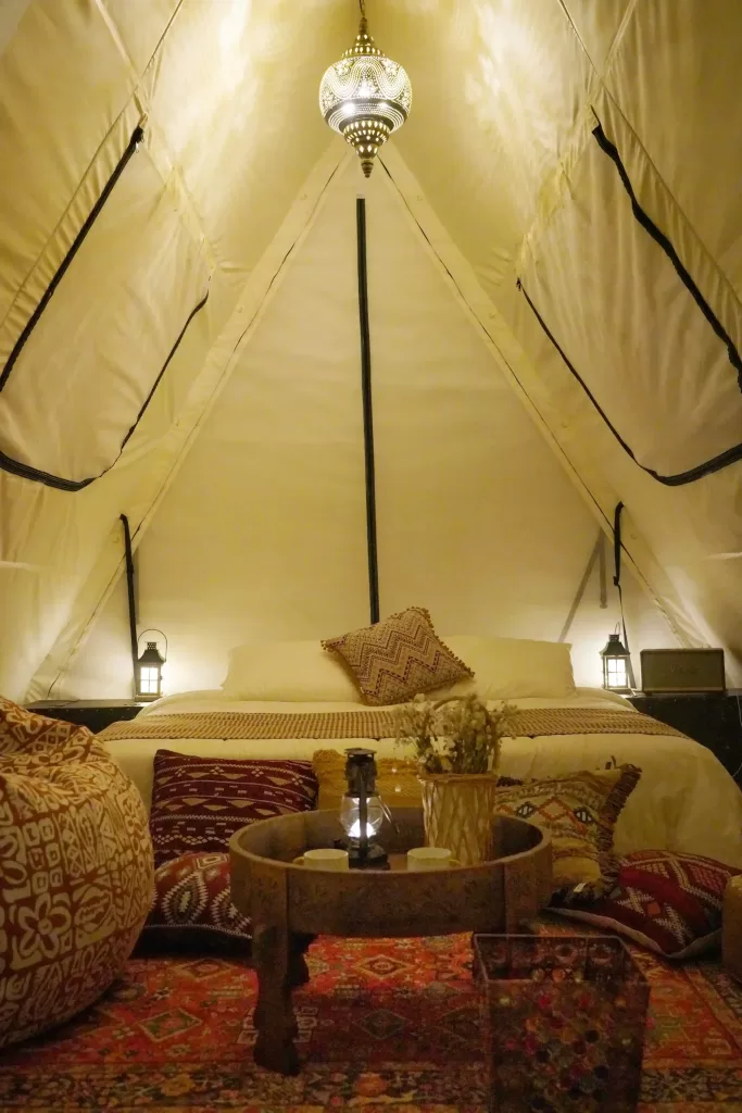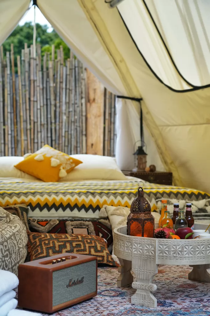 共有三顶野奢轻骑帐篷,每顶35平方英尺,采用PVC篷布和防水牛津布,打造非洲部落风格的露营小屋帐篷。我们的理念是在不牺牲乡村自然环境的前提下,让您住在野外帐篷里更贴近自然。豪华轻骑帐篷有水、电和宽敞的双人床。必要时,室内还可以提供榻榻米或木地板作为床垫,满足顾客休息的需求。每个豪华帐篷露营地都提供3x5m的阳台区域,让客人有放松的空间。野营帐篷配有天然环保的燃木浴缸。在星空下喝着您最喜欢的酒,度过一段特别的时光,享受极致的放松。