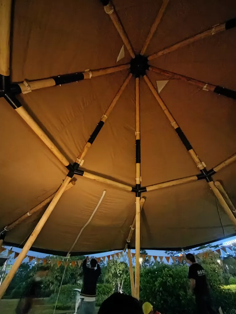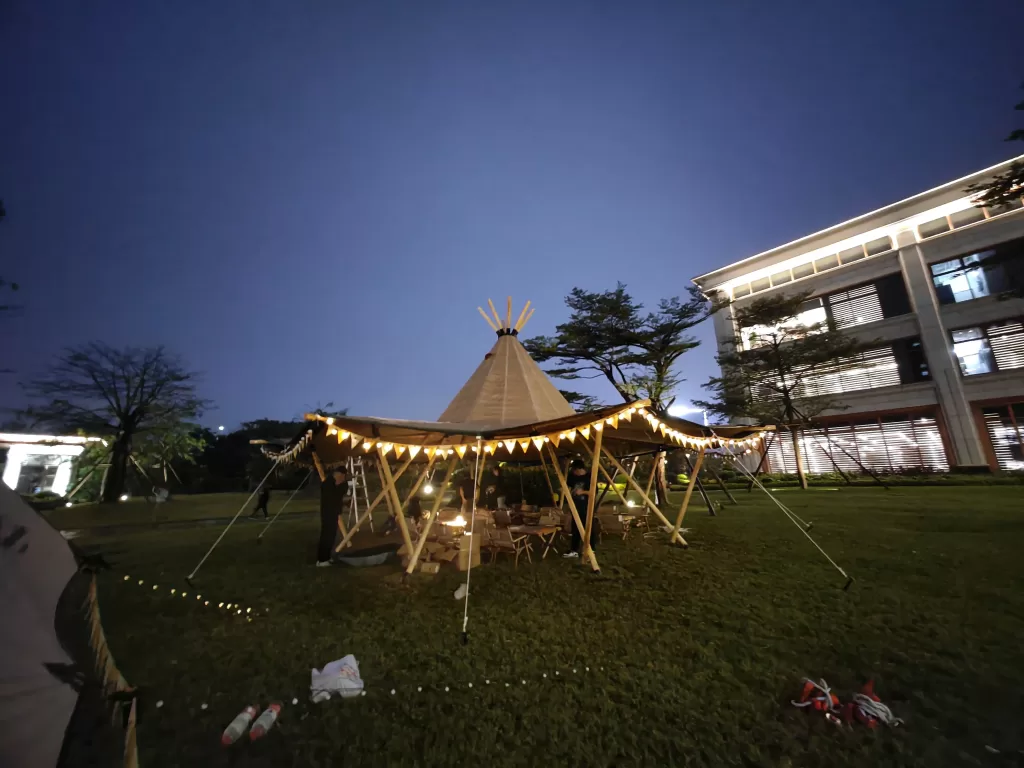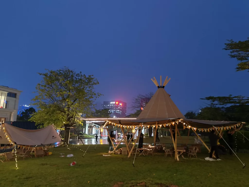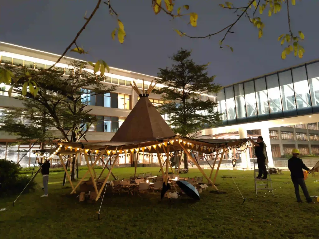 华为中国基地占地面积1.2平方公里,除华为研发大楼外,其余建筑均为个位数楼层的低密度建筑,按照现代园林布局设计,外围绿树成荫,内部设有水池。为了丰富员工生活,他们带着我们的野奢帐篷-Tipi在基地绿地上搭建了篝火活动营,以“聚心、理解、快乐户外旅行”为主题。