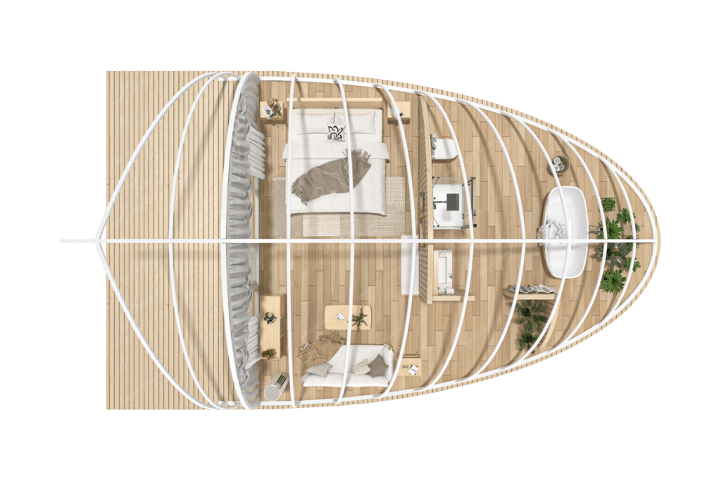 帐篷的设计充分考虑了通风和采光,透明的大窗户和宽敞的入口使得室内光线充足,视野开阔。宽敞的外部露台区域,是客人享受户外美景和进行各种休闲活动的理想场所。无论是晨间的咖啡时光还是夜晚的星空欣赏,贝壳帐篷都能为客人提供一个独特的体验。