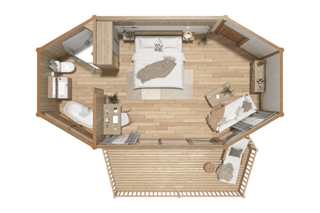 内部空间宽敞,布局合理。帐篷内设有一个豪华的卧室,配有舒适的床铺和现代化家具,为客人提供一个理想的休息空间。起居区布置精美,配有舒适的座椅和小桌,为客人提供一个放松和享受的场所。现代化的浴室设施齐全,提供淋浴和洗漱设备,确保客人在享受大自然的同时也能享有家的舒适。