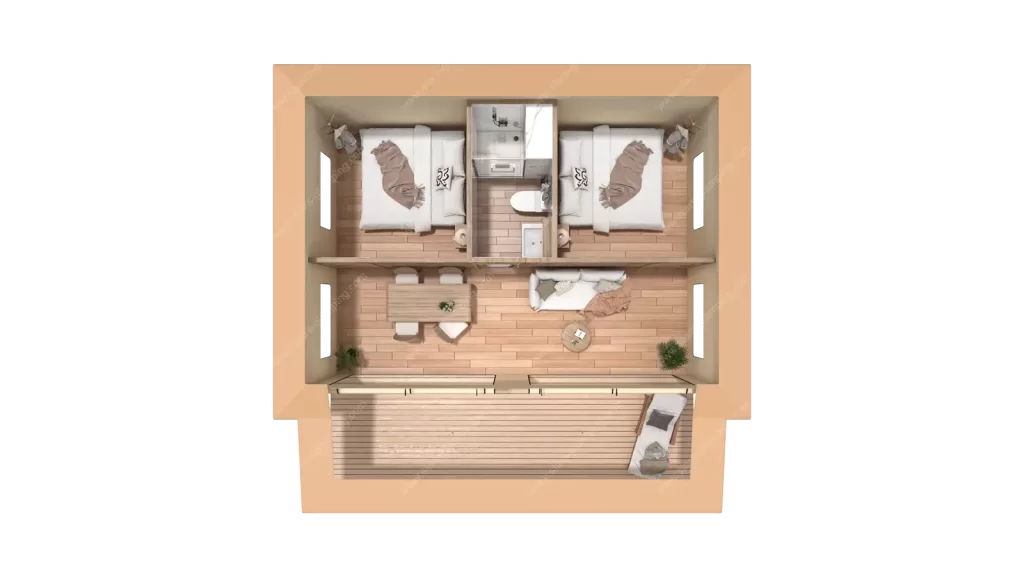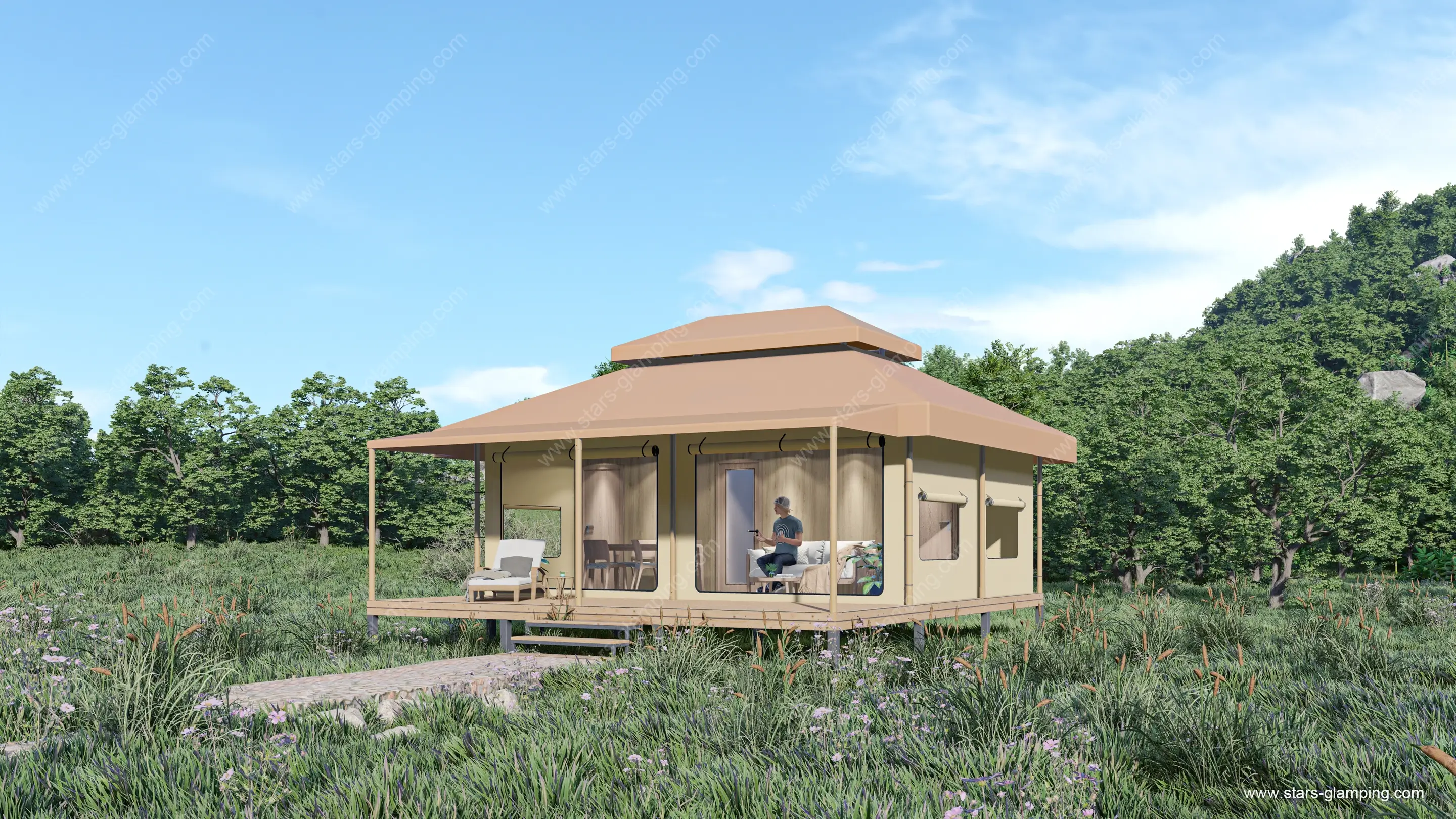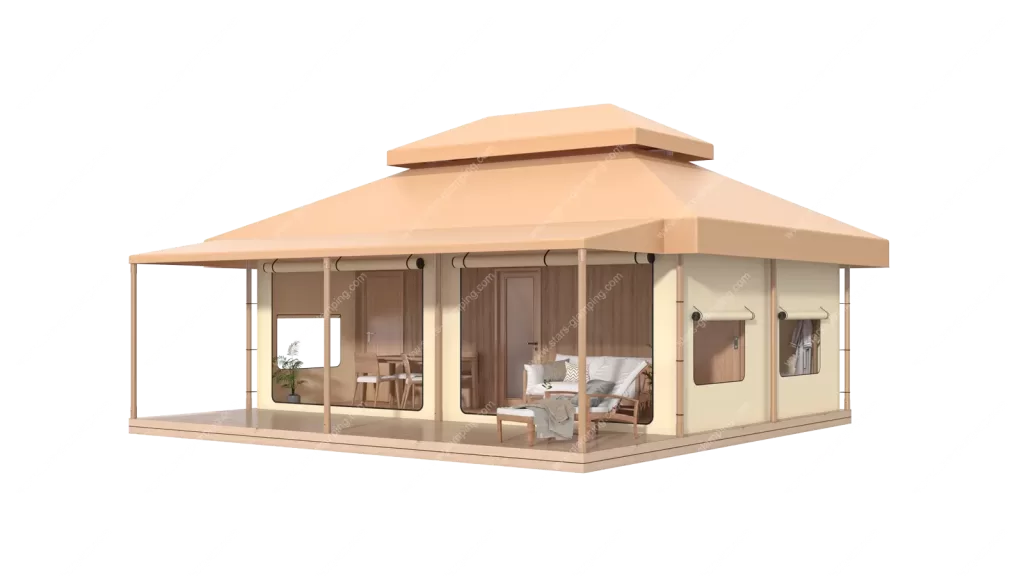 该帐篷适用于各种高端住宿场所,如酒店、度假村和精品民宿等,能为客人提供独特的住宿体验。内部设计合理,布局灵活,包括宽敞的卧室、现代化的浴室、舒适的起居区和开放的露台。无论是浪漫的度假情侣还是家庭旅行,安曼帐篷都能满足他们的需求,提供一个豪华且与自然亲密接触的居住空间。