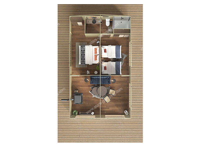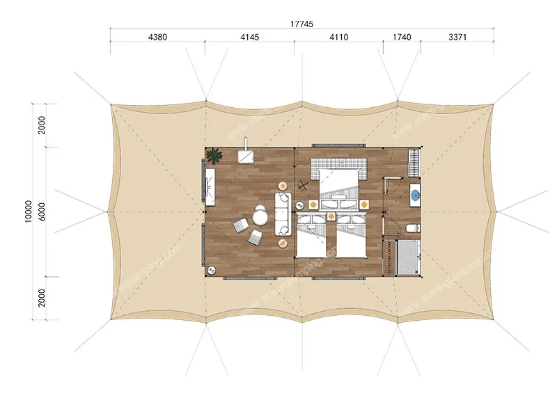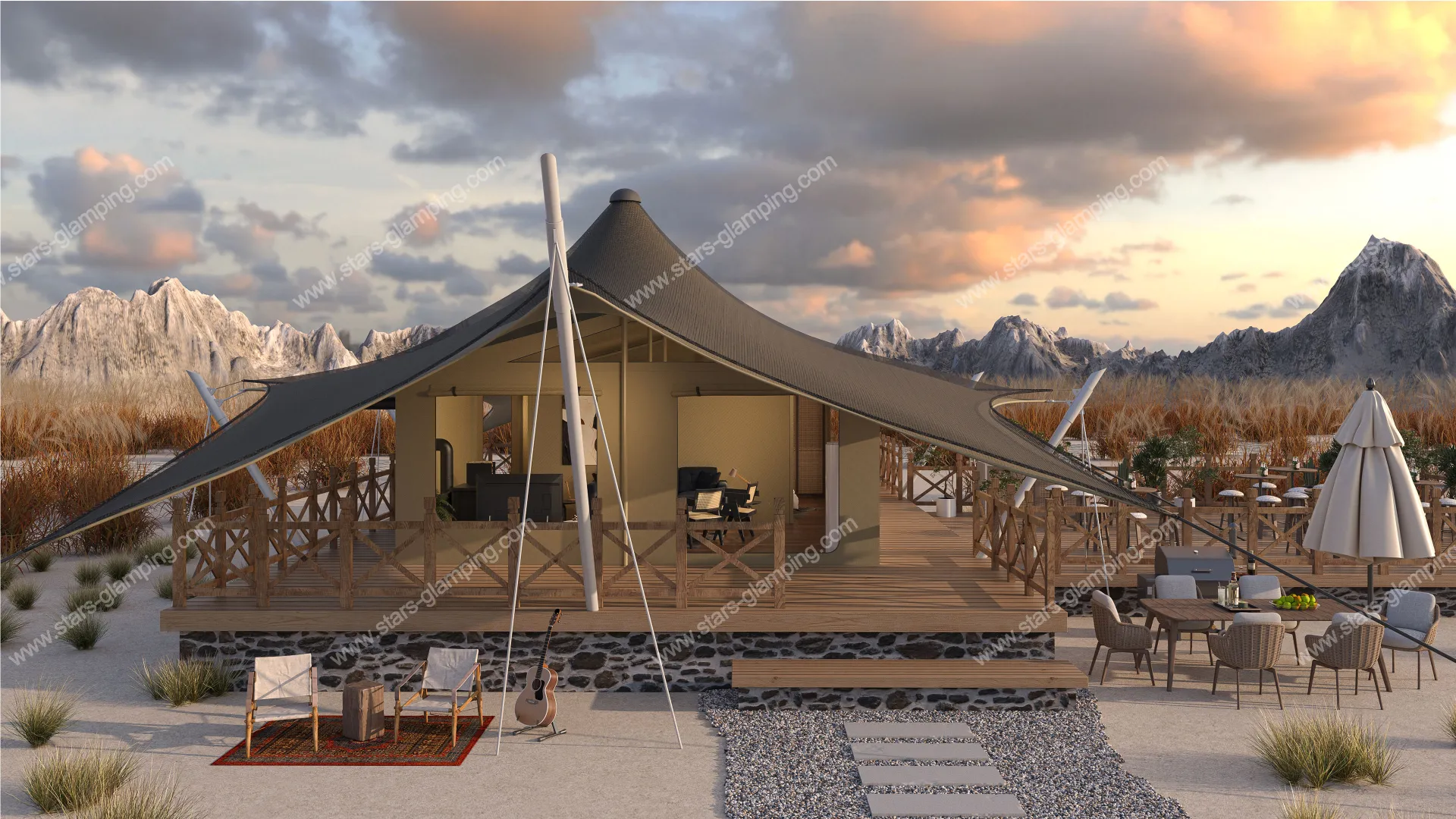 探险者III拥有宽敞的内部空间,包括一个温馨的卧室区域,配备高品质的床铺;一个独立的休闲区,布置了舒适的座椅;以及一个专用的工作区,配有书桌和椅子,方便您保持联系或记录旅途见闻。每个区域都经过精心设计,以提供最大的舒适性和功能性,确保您在帐篷内的每一刻都如在外探索时一样令人愉悦。