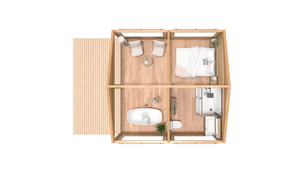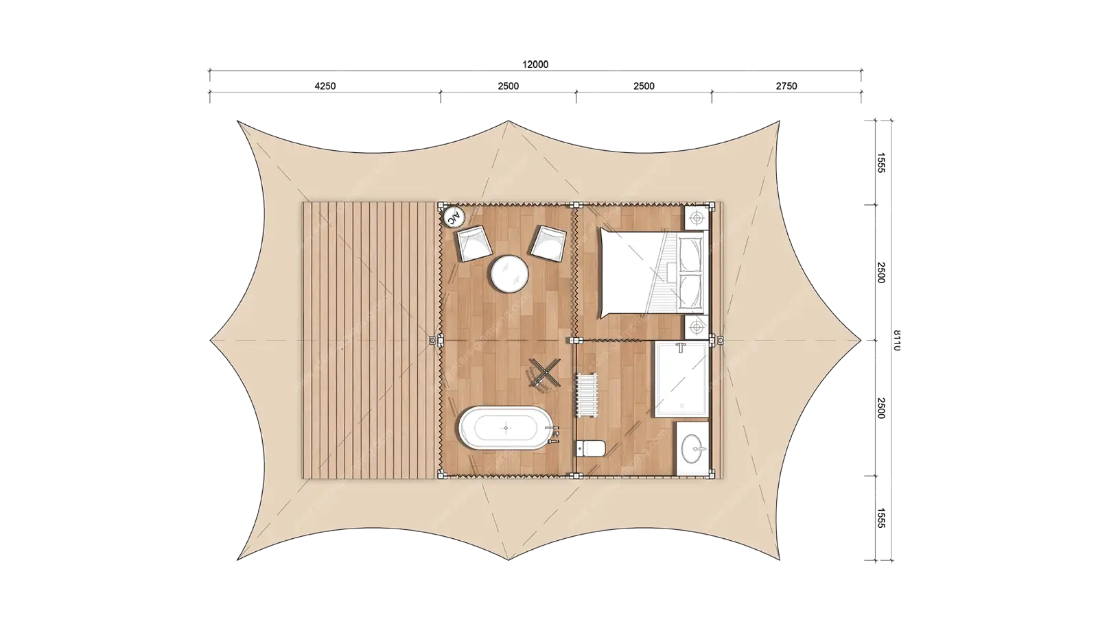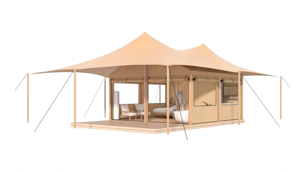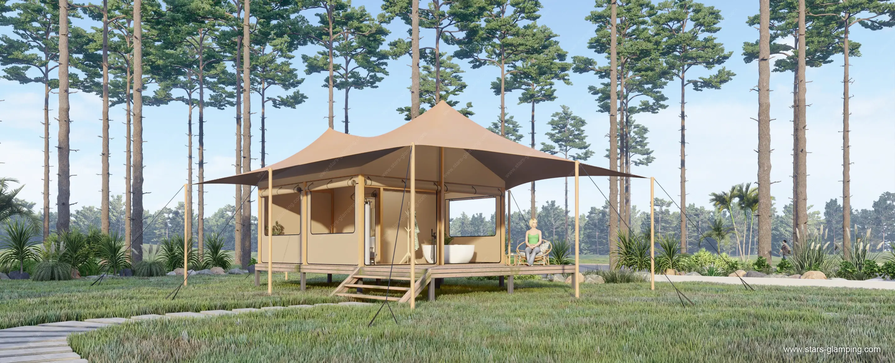 这款帐篷适用于各种高端住宿场所,如酒店、度假村和精品民宿等,能够为客人提供独特的住宿体验。内部布局合理,设计精巧,包括舒适的卧室、现代化的浴室、宽敞的起居区和开放的露台。无论是浪漫的度假情侣还是小家庭,星宿帐篷都能满足他们的需求,提供一个豪华且与自然亲密接触的居住空间。