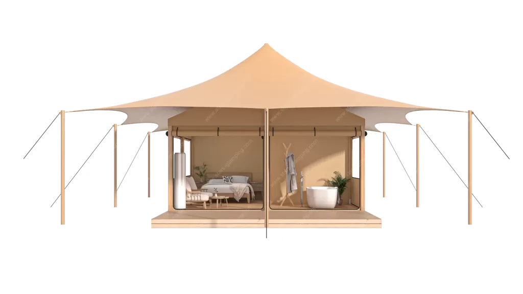 星宿帐篷以其宽敞的空间和优雅的设计,为客人提供了一个舒适且豪华的居住体验。主体框架采用进口芬兰松防腐实木,确保了结构的坚固性和耐用性。外层覆盖采用850g/㎡的PVC双面刀刮涂层布,具有极佳的防水和抗紫外线性能;内层则采用900D高密涤纶坐牛津布,增加了帐篷的舒适性和耐用性。