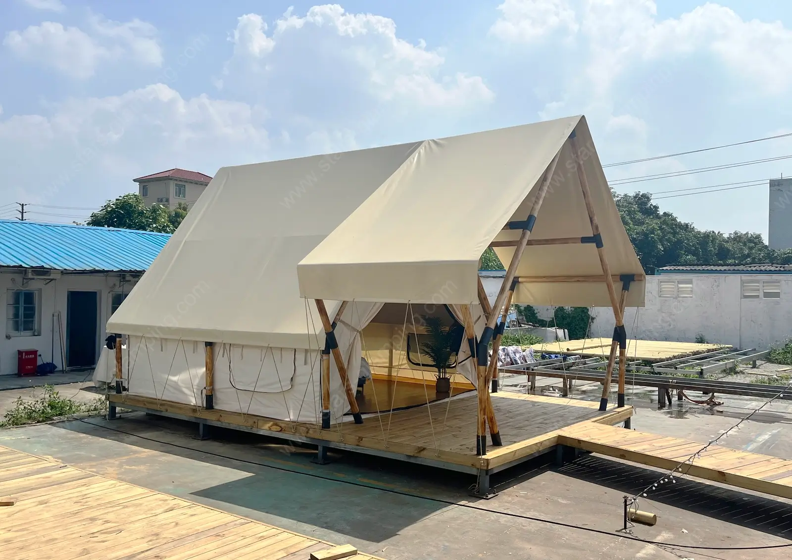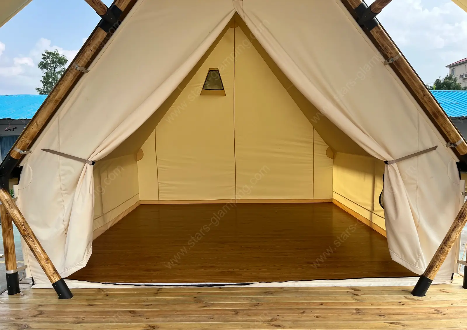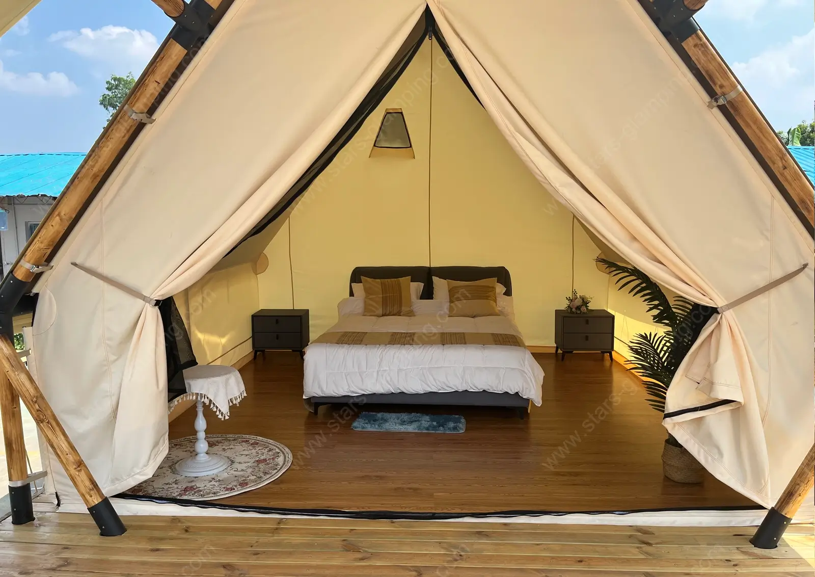 星野帐篷以其A字形设计和宽敞的内部空间,为客人提供了一个温馨且豪华的居住体验。主体框架采用进口芬兰松防腐实木,确保结构的坚固和耐用。外层覆盖采用850g/㎡的PVC双面刀刮涂层布,具有优异的防水和抗紫外线性能;内层则采用900D高密涤纶坐牛津布,增加了帐篷的舒适性和耐用性。
