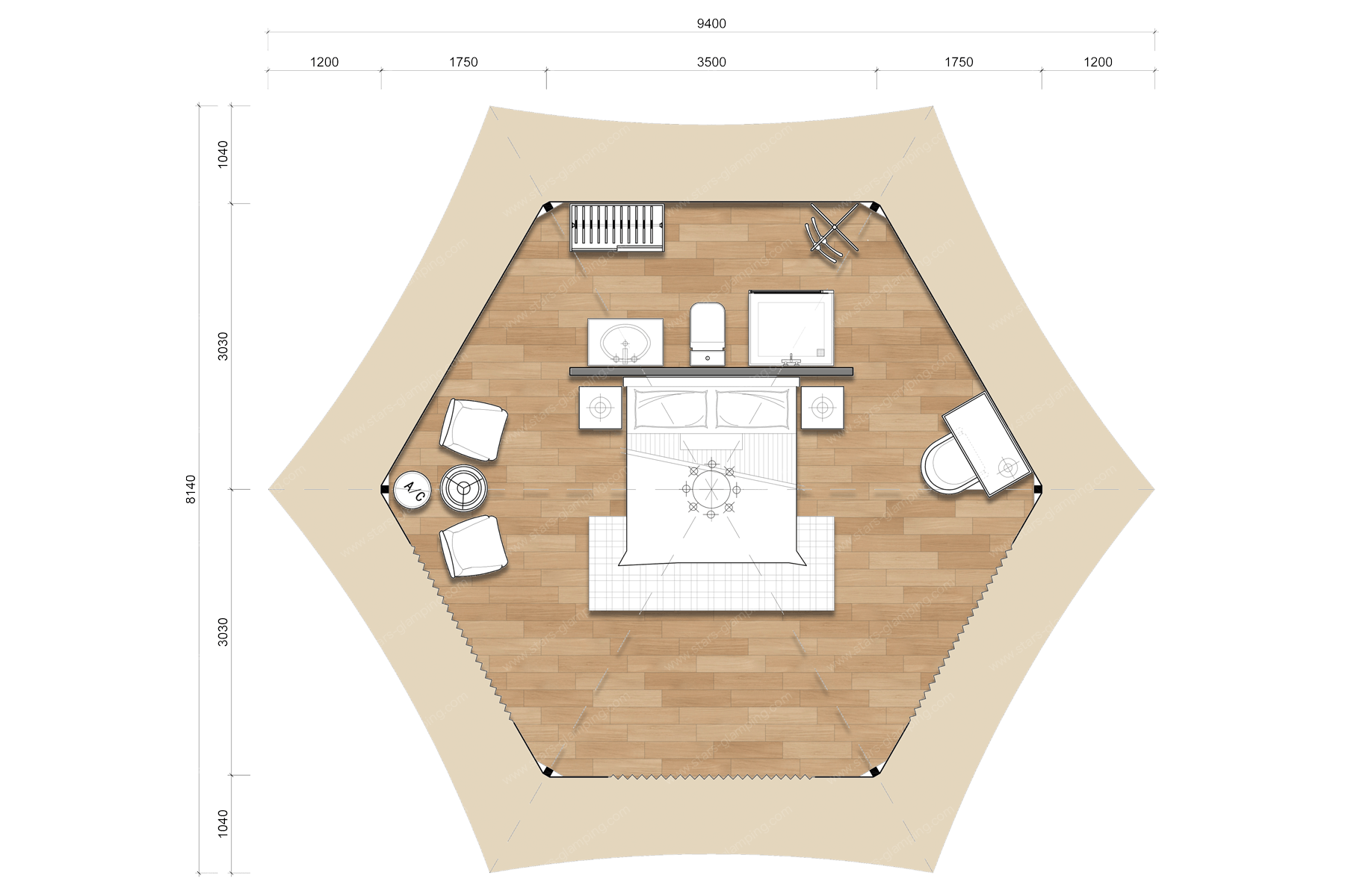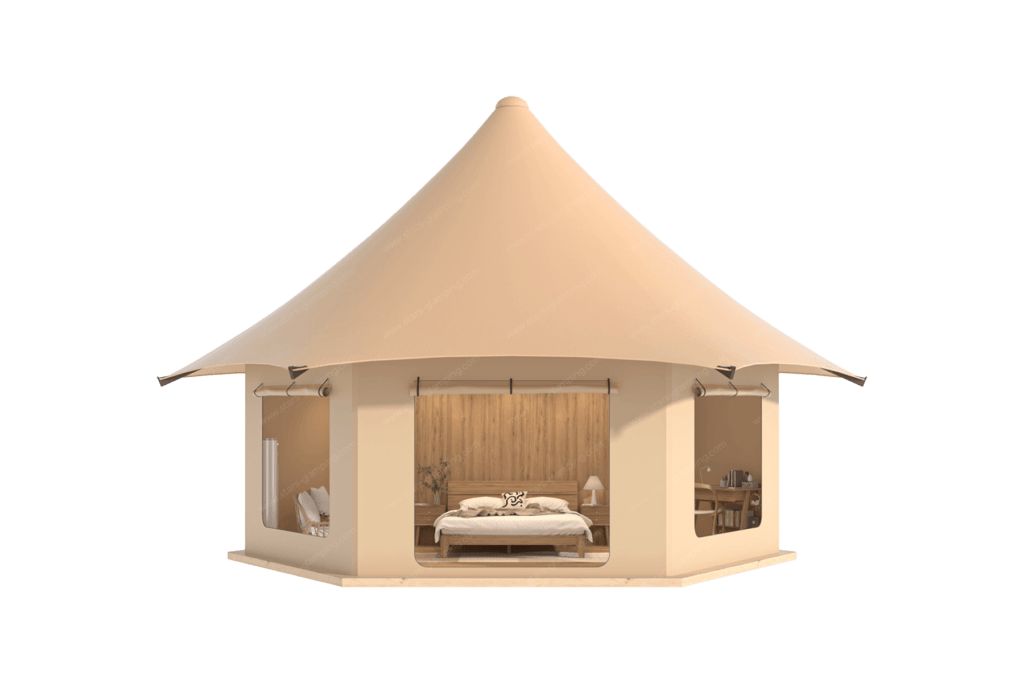 朝歌帐篷以其独特的六边形设计和豪华的内部装饰,为客人提供一个奢华且舒适的居住环境。帐篷采用高品质的材料和现代化的设计理念,确保了美观与实用的完美结合。