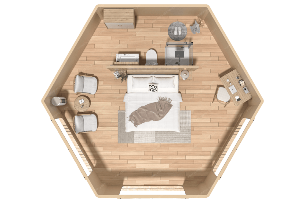 内部空间宽敞,布局合理。舒适的卧室配有豪华床铺,提供极致的睡眠体验。休闲区布置精致,配有现代化的家具和装饰,为客人提供一个放松和享受的空间。独立的卫浴区设施齐全,配有现代化的淋浴和洗漱设备,确保客人在享受大自然的同时也能享有家一般的舒适。