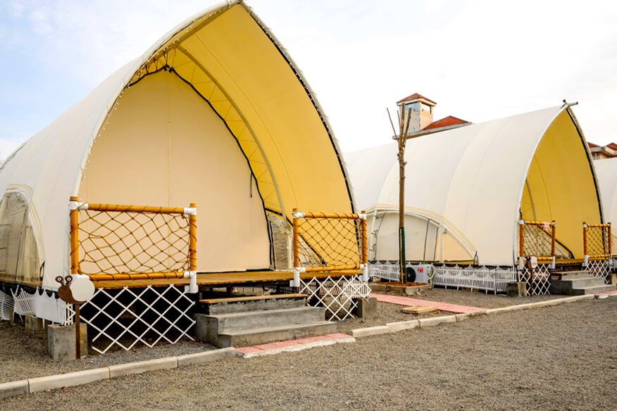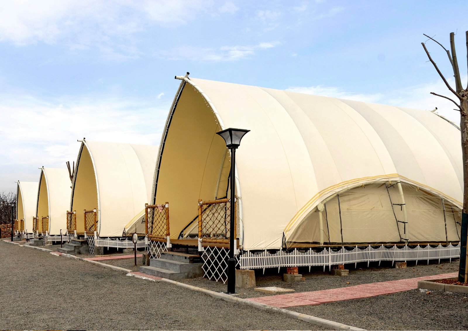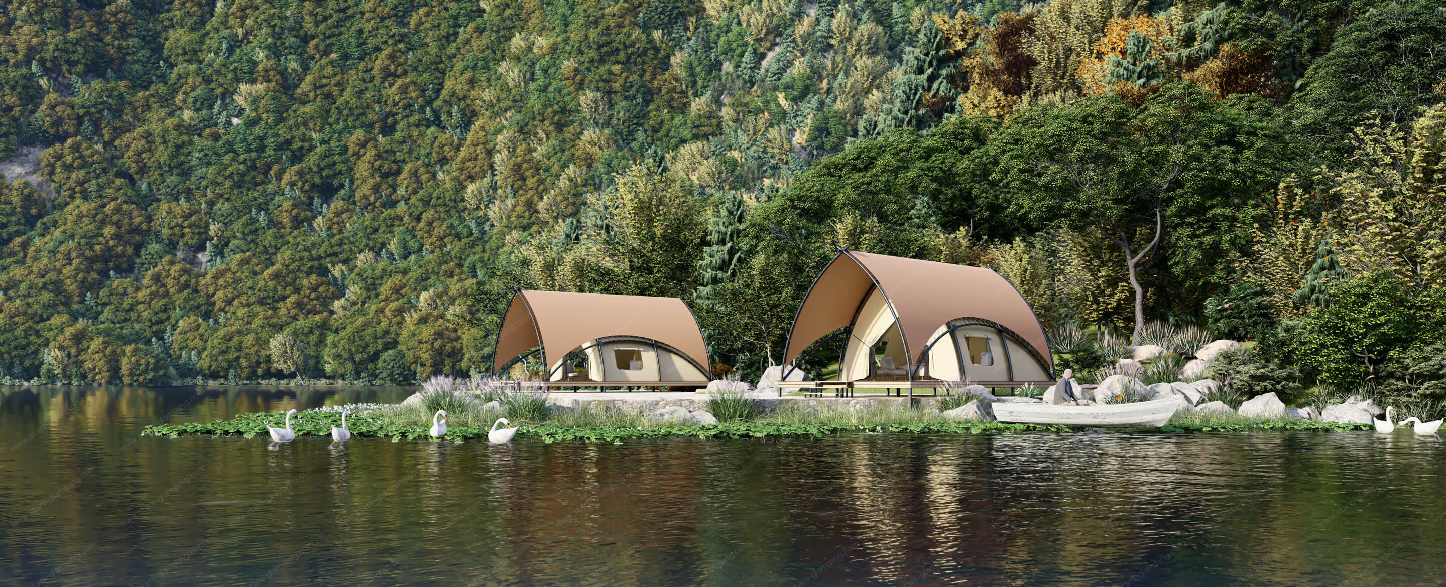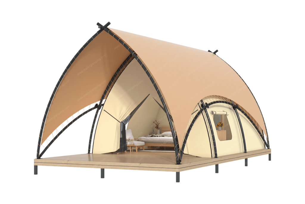 帆船帐篷以其独特的弧形设计和宽敞的空间,为客人提供了一个奢华且独特的居住体验。帐篷采用高质量的结构框架,确保了帐篷的稳定性和耐用性。外层覆盖使用防水和抗紫外线性能优越的布料,适应各种天气条件,提供全面的保护。