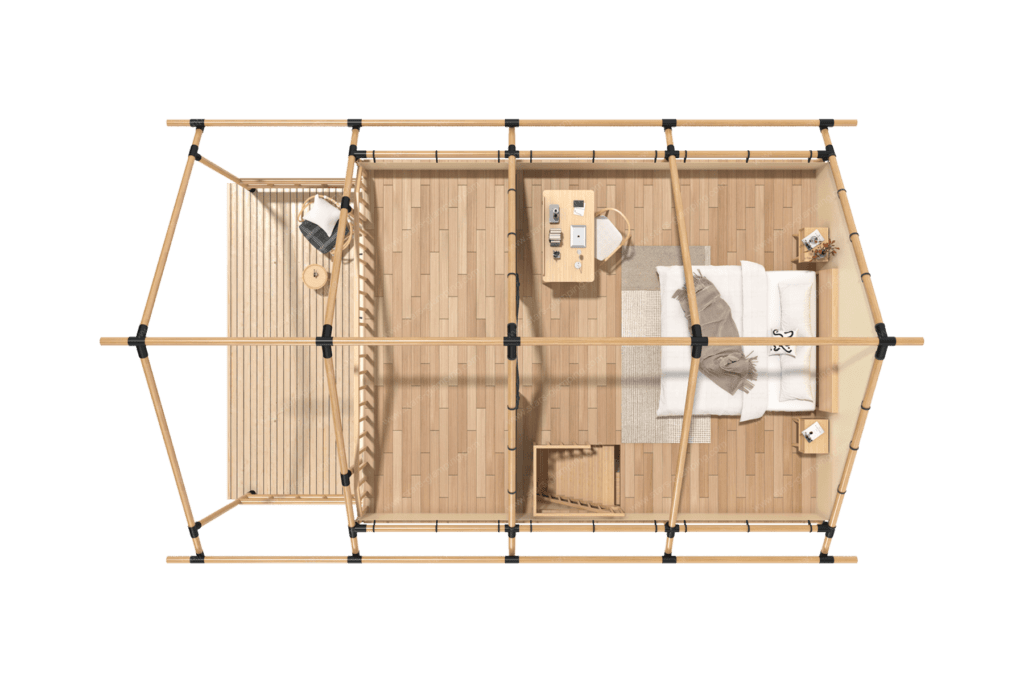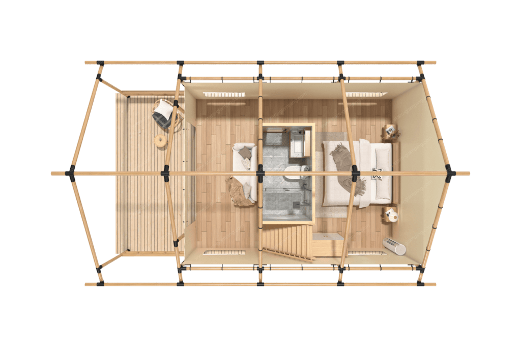 帐篷内部空间巧妙分为两层。一层设有宽敞的起居区,配有舒适的沙发和现代化家具,为客人提供一个放松和娱乐的理想场所。开放式厨房设施齐全,方便客人自助烹饪。卧室区域配有豪华床铺,提供极致的睡眠体验。现代化的浴室设施齐全,提供淋浴和洗漱设备,确保客人能够享受家的舒适。