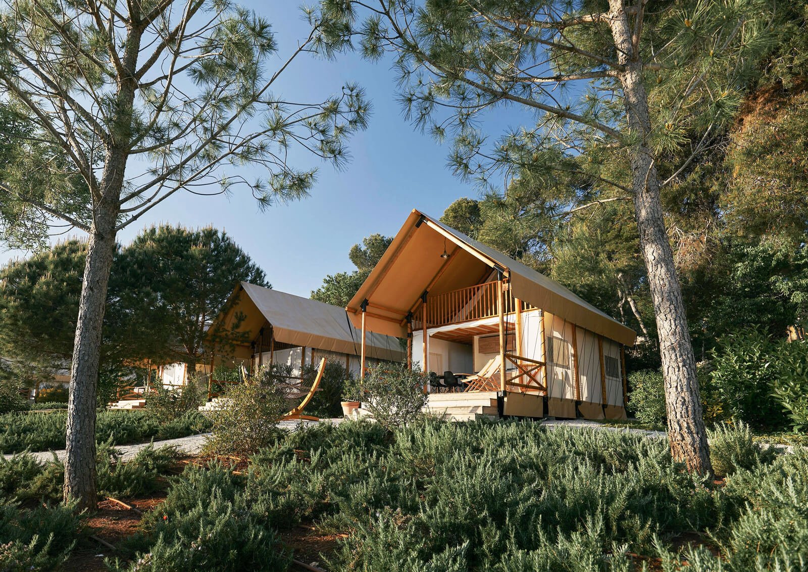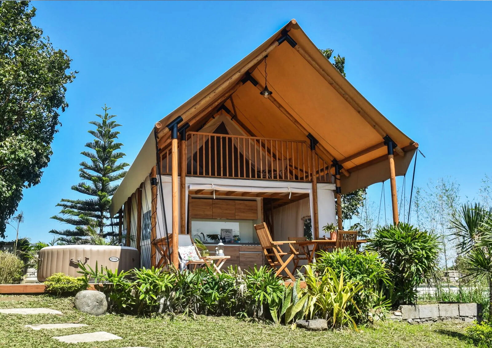 外部的露台区域宽敞,是享受户外美景和休闲时光的理想场所。无论是晨间的咖啡时光还是夜晚的星空欣赏,阁楼帐篷都能为客人提供一个独特的体验。
