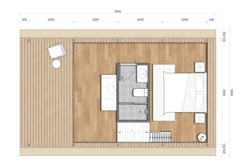 阁楼设计增加了额外的居住空间,适合儿童或额外的客人使用,提供了更多的隐私和独特的住宿体验。大面积的玻璃门窗设计,使得室内光线充足,视野开阔,营造出温馨的居住氛围。