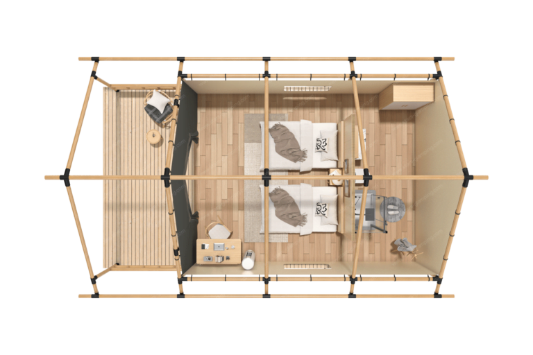 狩猎帐篷将现代设计与自然美景完美融合,为您的客人带来无与伦比的住宿体验。帐篷的框架由进口芬兰松防腐实木制成,坚固耐用。外层覆盖采用850g/㎡的PVC双面刀刮涂层布,确保帐篷具有出色的防水和抗紫外线性能;内层则采用900D高密涤纶坐牛津布,增加了帐篷的舒适度和保温性能。
