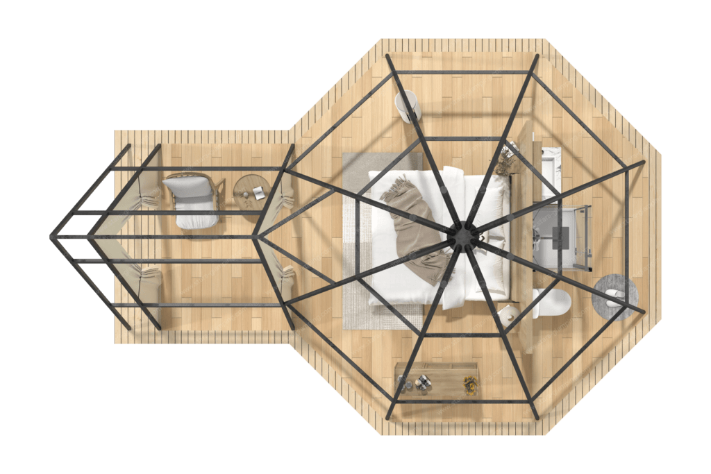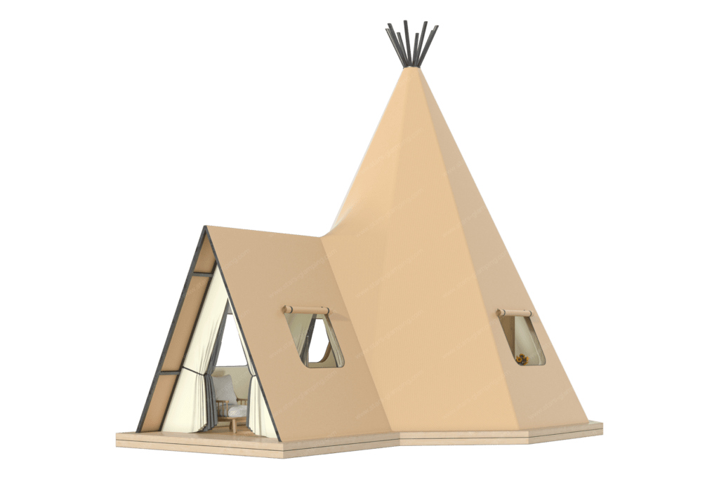 印第安帐篷融合了传统与现代设计,为客人提供独特而奢华的住宿体验。帐篷外观呈典型的印第安风格,搭配现代化的内部设施。坚固的76×2mm热镀锌钢管框架和850g/㎡ PVC双面刀刮涂层布,确保了卓越的防水和抗紫外线性能,内部加装140g绗缝保温内衬,提供良好的保温效果。