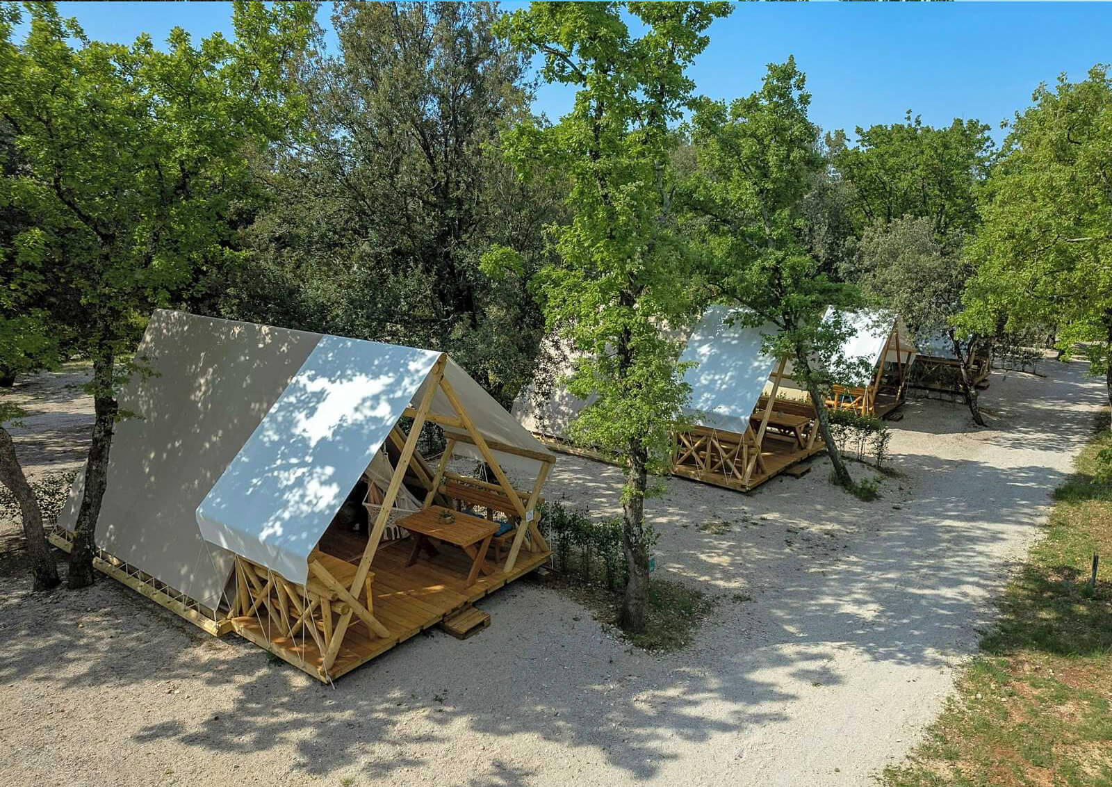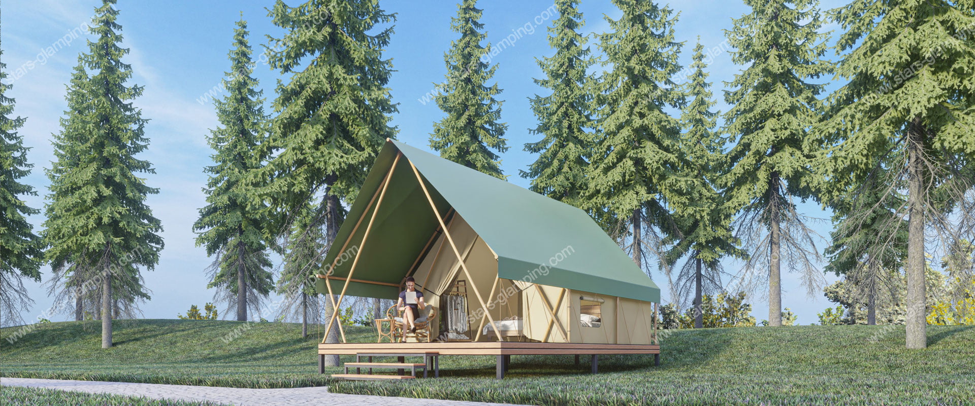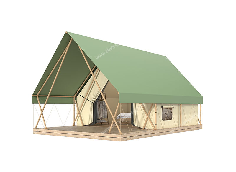 星野帐篷以其A字形设计和宽敞的内部空间,为客人提供了一个温馨且豪华的居住体验。帐篷的主体框架采用优质木材,确保结构的坚固和耐用,外层覆盖采用高质量的防水布料,提供卓越的防水和抗紫外线性能。