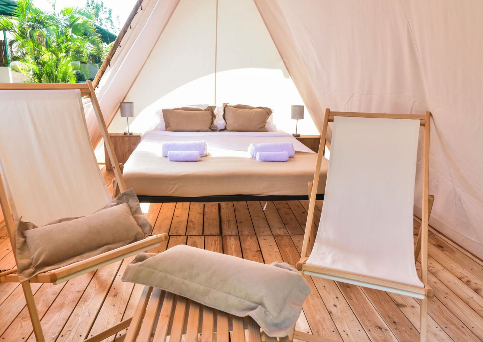 帐篷的露台区域宽敞,是享受户外时光的理想场所,无论是晨间的咖啡时光还是夜晚的星空欣赏,都能为客人带来独特的体验。